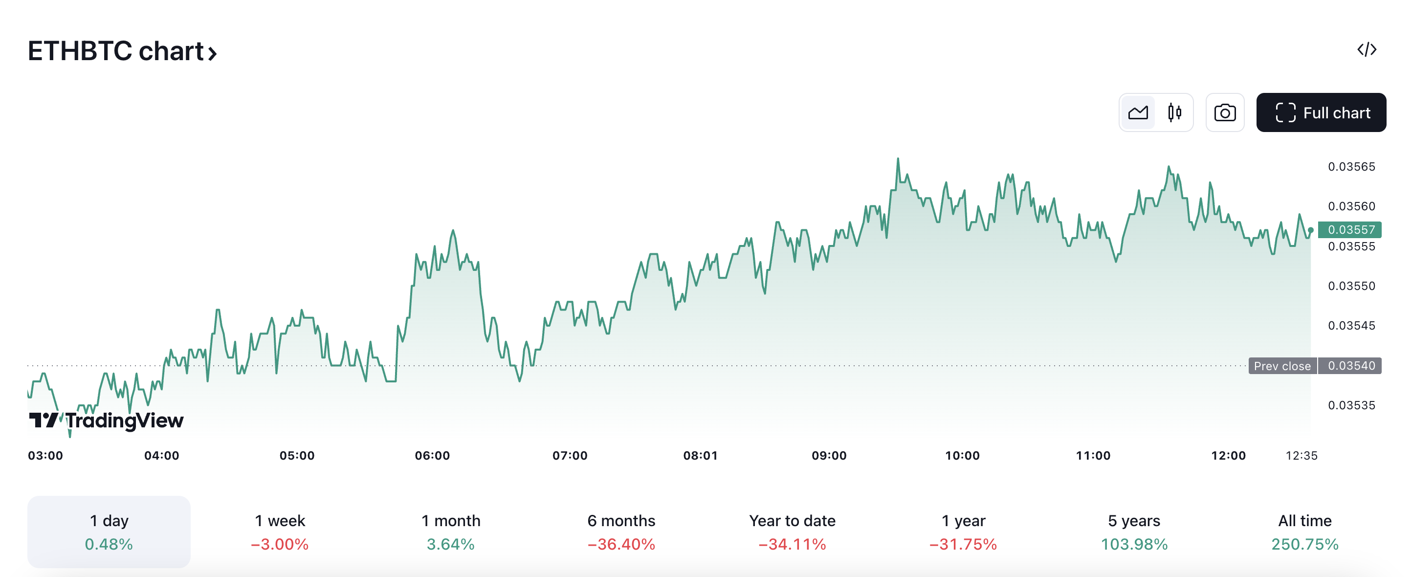 Соотношение ETH/BTC отражает относительную силу Ethereum по отношению к биткоину. Иными словами, он показывает, сколько BTC стоит один ETH.