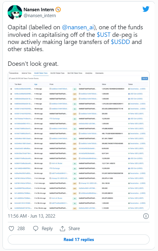 Аналитическая блокчейн-платформа Nansen недавно сообщила, что хедж-фонд Oapital, который заработал огромные средства на крахе Terra, переводит значительные суммы USDD и других стейблкоинов.