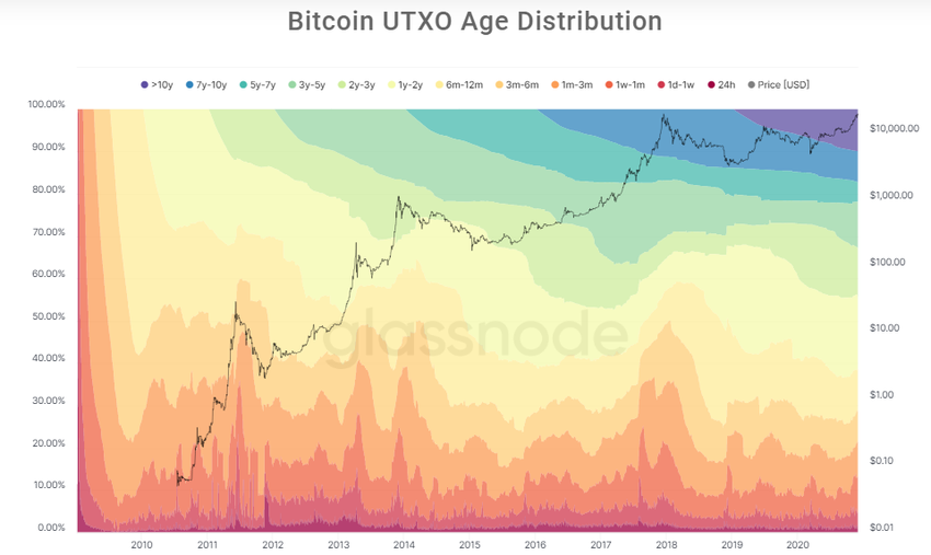 Возрастное распределение биткоина (UTXO). Источник: HODL Waves