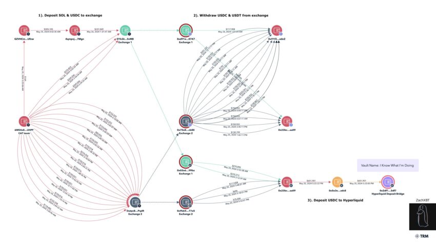 Адрес 6M54x получил около 15 тыс. SOL ($2,5 млн) от продажи CAT и перевел средства на Kucoin и MEXC. После этих депозитов ZachXBT зафиксировал выводы аналогичных сумм на Ethereum и Arbitrum.