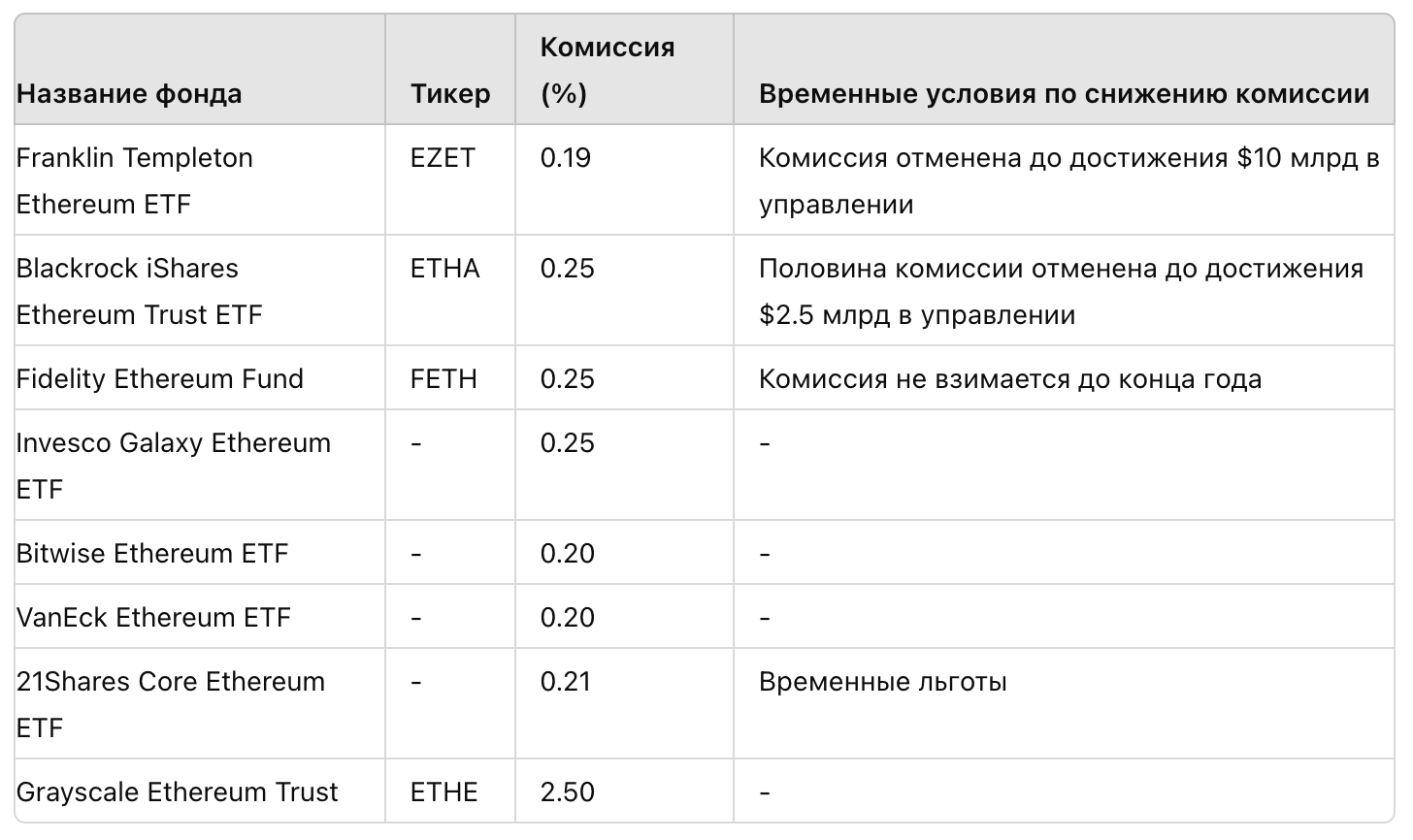 Многие компании-эмитенты решили временно отменить или снизить сборы, чтобы привлечь больше инвесторов. Например, управляющий активами Franklin убрал комиссию до января 2025 года. Или до тех пор, пока в фонд не инвестируют $10 млрд.