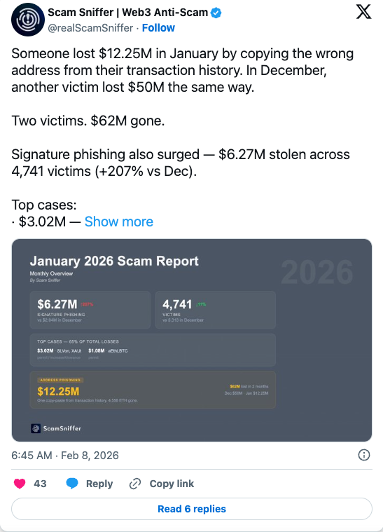 В январе единичный инцидент привел к потере $12.2 млн. Жертва случайно скопировала мошеннические реквизиты из истории своих транзакций. Этому случаю предшествовала еще одна крупная кража в декабре. Тогда аналогичная тактика позволила злоумышленникам похитить около $50 млн.