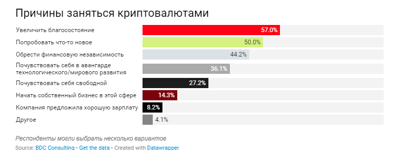 Исследования BDC Consulting доказывают, что женщины активно инвестируют в криптовалюты, чтобы получить быстрый доход и улучить свое благосостояние. Среди других причин, которые мотивируют женщин инвестировать в криптовалюты — желание попробовать что-то новое и обрести финансовую независимость.