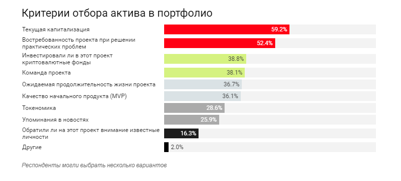 Что же касается критериев выбора проекта для инвестирования, то женщины руководствуются следующими: 59% назвали среди важнейших критериев капитализацию актива, 52% — востребованность проекта для решения насущных проблем, а 39% — факт финансирования проекта криптовалютными фондами. Интересно, что лишь для 16% важно, чтобы о проекте хорошо отзывались известные личности.