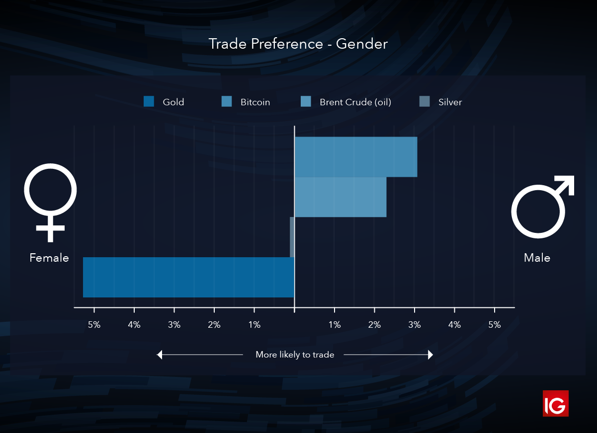 Исследование компании IG показывает, что женщины гораздо активнее торгуют золотом, тогда как мужчины выбирают нефть и биткоин. Между тем, согласно статистике, женщины более успешно торгуют золотом (85% успешных сделок), нефтью (82% успешных сделок) и биткоином (76% успешных сделок). Для мужчин показатели прибыльности по этим классам активов составили 83%, 79% и 71% соответственно.