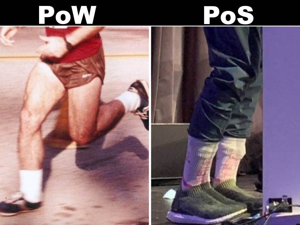 Впрочем, не все поддерживают переход ETH на PoS. Многие участники рынка считают, что PoW стабильнее и безопаснее аналога. Один из пользователей сети сравнил алгоритмы при помощи двух фото. Справа изображены ноги соучредителя Ethereum Виталика Бутерина во время его выступления на одной из конференций. Внешний вид разработчика часто вызывает вопросы у инвесторов.
