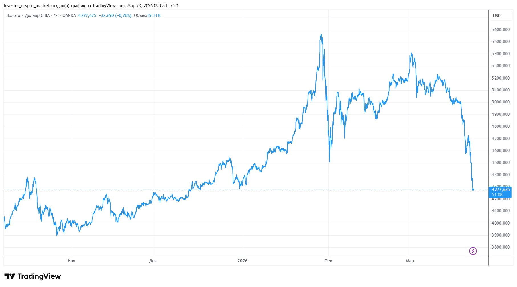 В начале недели золото подешевело еще на 2%. На момент написания обзора, металл торгуется по $4 277 — такие уровни фиксировались в конце 2025 года. За три недели агрессивных продаж рынок полностью растерял весь рост, накопленный в начале 2026 года.