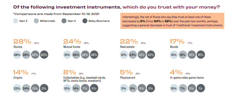 Более того, оказалось, что поколение беби-бумеров куда больше (5%) заинтересовано в невзаимозаменяемых токенах (NFT), чем в криптовалютах. В целом же цифровые активы оказались куда менее привлекательны для всех возрастных групп респондентов, чем акции, недвижимость и облигации.