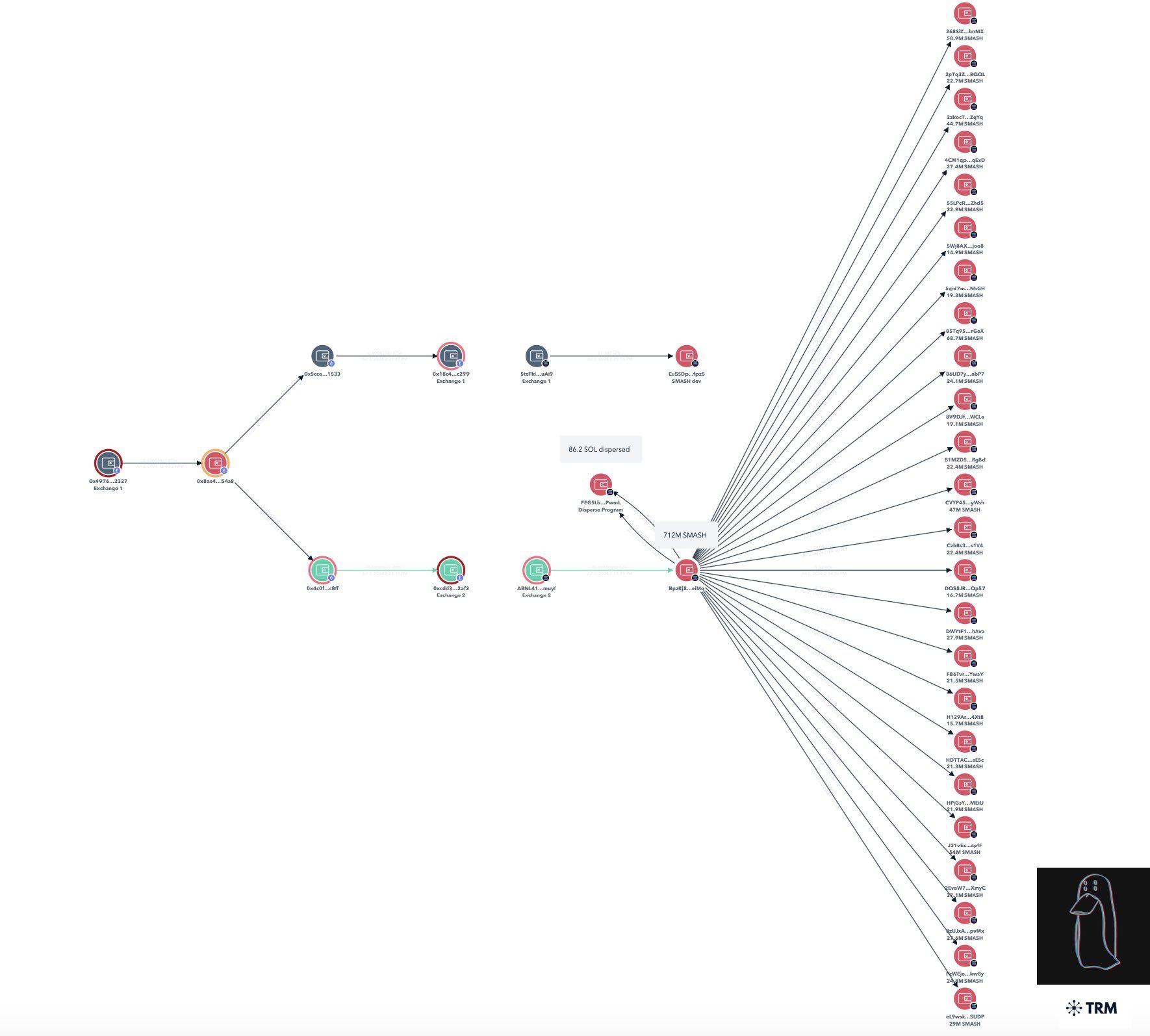 Согласно анализу эксперта, по меньшей мере 71% предложения монет напрямую связан с инсайдерскими кошельками, которые пополняли с того же адреса на Ethereum, что и кошелек разработчика токена SMASH на Solana.