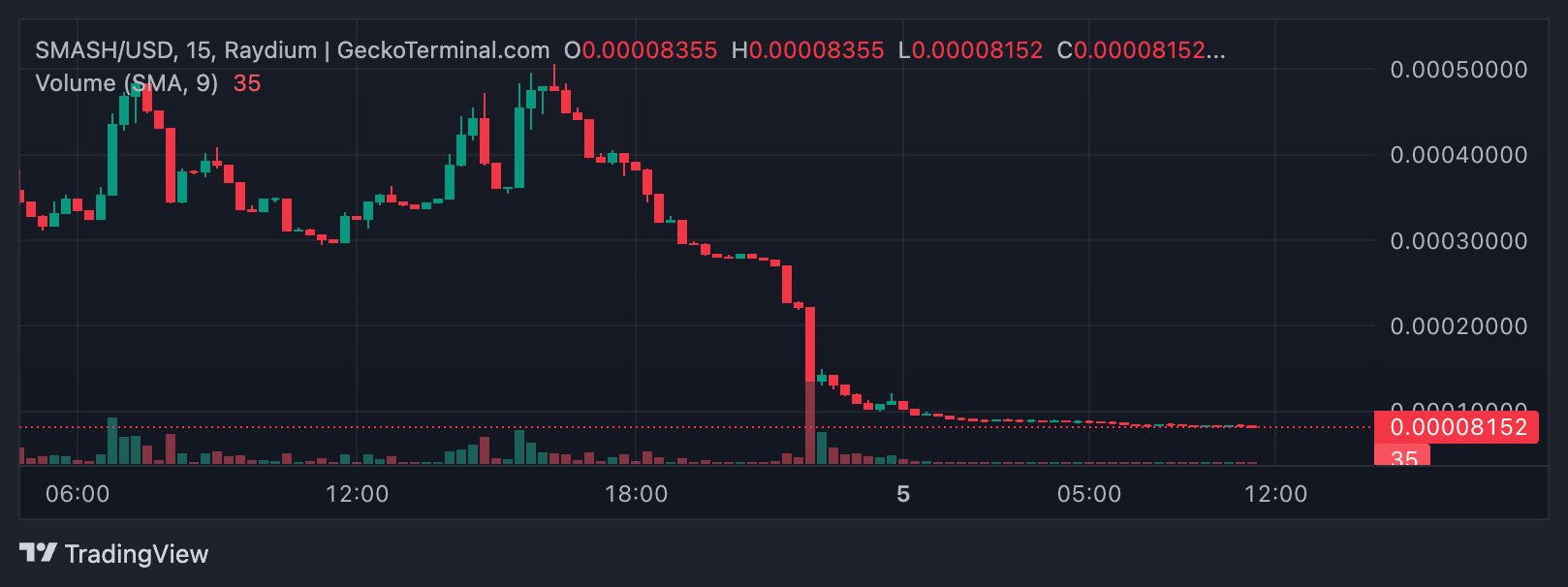 По данным GeckoTerminal, за последние сутки курс SMASH обвалился на 72%. В моменте цена проседала более чем на 96%. Капитализация «мемной» монеты составляет $82 тыс., а объем торгов едва превышает $116 тыс.